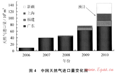 進(jìn)口液化天然氣(LNG)正在幫助緩解因需求迅速上升給國內(nèi)市場供應(yīng)帶來的壓力。自2006年5月26日國內(nèi)第一船進(jìn)口6×104t澳大利亞液化天然氣運(yùn)抵深圳大鵬灣以來,國內(nèi)進(jìn)口液化天然氣設(shè)施已發(fā)展到3座,分布在廣東深圳、福建莆田和上海洋山,規(guī)模分別為370×104t/a、260×104t/a和300×104t/a。2009年液化天然氣進(jìn)口量已由2006年的69×104t猛增到553×104t(76×108m3)(圖4)。進(jìn)口液化天然氣以用作發(fā)電和工業(yè)燃料為主,也有一部分進(jìn)入城市天然氣管道,滿足民用燃?xì)庑枨蟆kS著上海洋山進(jìn)口設(shè)施轉(zhuǎn)入正常運(yùn)轉(zhuǎn),并保障上海世博會期間的燃?xì)夤?yīng),中海油3座進(jìn)口設(shè)施2010年的進(jìn)口量可能會輕易超過800×104t。今后兩三年內(nèi),當(dāng)中石油江蘇如東和遼寧大連以及中海油浙江寧波共3座在建進(jìn)口設(shè)施建成投產(chǎn)時,液化天然氣年進(jìn)口規(guī)模將由現(xiàn)在的930×104t擴(kuò)大到1880×104t。中海油預(yù)計(jì)到2020年僅該公司就將擁有5000×104t/a進(jìn)口液化天然氣接收能力。