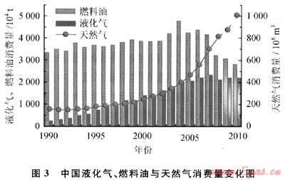 天然氣市場現(xiàn)正處于高速增長的時期。在西氣東輸項(xiàng)目完工并于2004年10月開始向華東地區(qū)供氣后的5年里,國內(nèi)天然氣消費(fèi)量年均增幅達(dá)17%,2009年消費(fèi)量已增加到874×108m3[6]。而在這之前,20世紀(jì)90年代10年里的年均增幅只有4.5%。2010年,國內(nèi)天然氣消費(fèi)量估計(jì)將達(dá)到1050×108m3,到2020年預(yù)計(jì)將增長兩倍達(dá)到3000×108m3,受沖擊最大的是燃料油和液化氣,液化氣需求增長將受到嚴(yán)重阻礙(圖3)。
