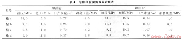 在生產(chǎn)過程中,常出現(xiàn)油套壓差增大的情況,說明井底或井筒中有積液,如果氣井井底或井筒積液嚴(yán)重,對氣井的生產(chǎn)會帶來很大的影響。由于低產(chǎn)井的產(chǎn)能普遍比較低,部分井的產(chǎn)量不能滿足攜液要求,如果積液不及時(shí)帶出,將嚴(yán)重影響氣井連續(xù)穩(wěn)定生產(chǎn)。為了更好地發(fā)揮氣井產(chǎn)能,結(jié)合泡沫排水采氣工藝,針對油套壓差相對較大、井底或井筒中有積液的氣井,間歇性加入起泡劑,排除凝析水,延長開井周期。目前在榆林南區(qū)正大面積推廣[2~3](表4)。