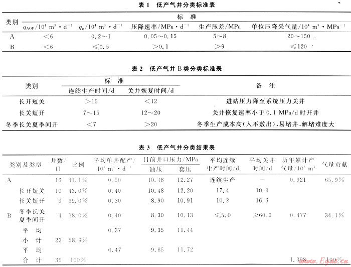 為了提高低產(chǎn)井的采氣時(shí)率和采收率,便于對氣井進(jìn)行更好地開發(fā)與管理,依據(jù)氣井的儲層參數(shù),結(jié)合生產(chǎn)動態(tài)和穩(wěn)產(chǎn)能力,對低產(chǎn)井進(jìn)行分類,實(shí)現(xiàn)低產(chǎn)井的精細(xì)管理(表1、2、3)。