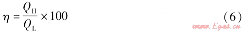 氣體高熱值或者低熱值參與熱效率公式的計(jì)算后,對(duì)熱效率計(jì)算結(jié)果影響很大。通過(guò)下式得到高、低熱值參與計(jì)算后對(duì)熱效率的影響,表達(dá)式為: