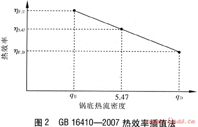 GB 16410—2007中的熱效率插值法是以鍋底熱流密度作為橫坐標(biāo),以熱效率作為縱坐標(biāo)建立直角坐標(biāo)系。當(dāng)用上限鍋測(cè)試熱效率時(shí),其橫坐標(biāo)點(diǎn)qU對(duì)應(yīng)的熱效率為ηF,U;用下限鍋測(cè)試熱效率時(shí),其橫坐標(biāo)點(diǎn)qD對(duì)應(yīng)的熱效率為ηF,D。然后以橫坐標(biāo)為5.47的豎直直線與ηF,U、ηF,D兩點(diǎn)連線的交點(diǎn)的縱坐標(biāo)值,作為此灶具燃燒器熱效率的最終結(jié)果η5.47(見(jiàn)圖2)。熱效率插值法是在不改變熱負(fù)荷的前提下得到的。