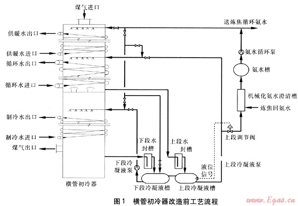 5臺(tái)橫管初冷器并聯(lián)操作,煤氣從橫管初冷器上部進(jìn)入,為了保證初冷器對(duì)煤氣的冷卻效果,用水對(duì)煤氣分3段進(jìn)行冷卻。上段冬季進(jìn)水水溫為47℃,出水水溫為60℃,為合理利用熱量,將出水為附近居民供暖,回水再去上段冷卻煤氣,故該廠稱此水為供暖水。其余時(shí)間上段同中段一樣,用進(jìn)水水溫為32℃、出水水溫為45℃的循環(huán)水對(duì)煤氣進(jìn)行冷卻。下段用16℃制冷水將煤氣冷卻至18~22℃。為保證初冷器的冷卻除萘效果,在中、下段頂部連續(xù)噴灑焦油、氨水混合液,在上段頂部用熱氨水循環(huán)噴灑,以清除管壁上的焦油、萘等雜質(zhì)。初冷器上、中段排出的冷凝液經(jīng)水封槽流入上段冷凝液槽,用泵將其送入初冷器中段頂部循環(huán)噴灑,下段冷凝液槽內(nèi)多余的部分送到機(jī)械化氨水澄清槽。初冷器下段排出的冷凝液經(jīng)水封槽流入下段冷凝液槽,用泵將其送入初冷器下段頂部循環(huán)噴灑,下段冷凝液槽內(nèi)多余部分流入上段冷凝液槽。橫管初冷器改造前工藝流程見(jiàn)圖1。