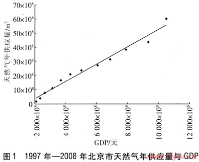 1997年—2008年北京市的GDP與天然氣年供應(yīng)量見表1,對(duì)應(yīng)關(guān)系見圖1,從圖1可知天然氣年供應(yīng)量與GDP存在線性關(guān)系。