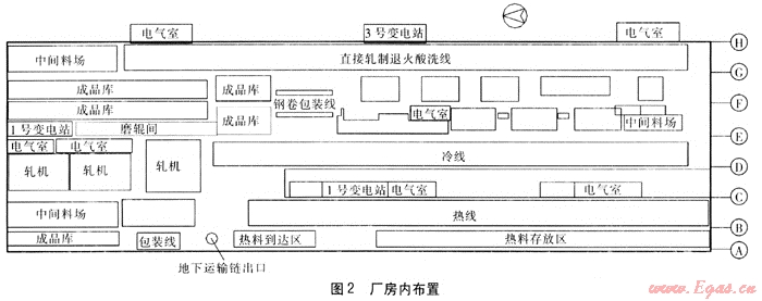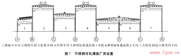 不銹鋼冷軋薄板工程占地面積約14×104m2,廠房總長(zhǎng)度為690m,總寬度為204m,由相鄰的多跨車間組成??偨ㄖ娣e為12.861×104m2,其中熱板坯車間建筑面積為14490m2,該車間不供暖。其他車間建筑面積為11.412×104m2,為供暖區(qū)域。由于供暖區(qū)域內(nèi)包括磨輥間、變電站、成品庫(kù)等不需供暖的部位,因此為簡(jiǎn)化問(wèn)題,供暖面積按11×104m2考慮。不銹鋼冷軋薄板廠房設(shè)置及廠房?jī)?nèi)布置分別見圖1、2。