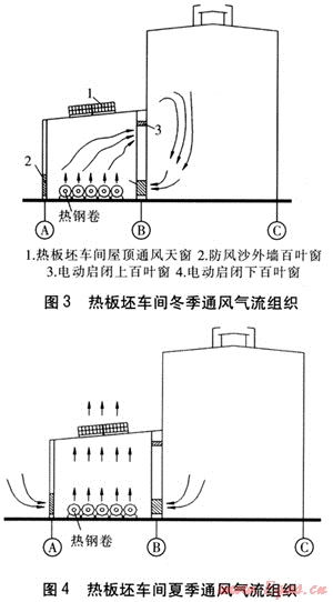 熱線、冷線、直接軋制退火酸洗線車間都有加熱爐存在,都會(huì)散發(fā)大量余熱,造成車間溫度的顯著上升。為此,上述車間都需要在加熱爐段設(shè)置通風(fēng)天窗。夏季通風(fēng)天窗全部開啟排風(fēng),依靠的下部周邊窗戶自然進(jìn)風(fēng),消除余熱。冬季盡量關(guān)閉天窗,使熱氣流向下對(duì)流,不足熱負(fù)荷需考慮在車間的首尾段增設(shè)供暖設(shè)施。并考慮在高側(cè)墻設(shè)置軸流風(fēng)機(jī)強(qiáng)化通風(fēng)效果。
