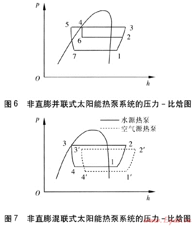 直膨式、非直膨并聯(lián)式、非直膨混聯(lián)式太陽(yáng)能熱泵系統(tǒng)的壓力-比焓(p-h)圖見圖5~7。由圖5可知,在直膨式太陽(yáng)能熱泵系統(tǒng)中,由冷凝器出來(lái)的工質(zhì)經(jīng)過(guò)膨脹閥節(jié)流(4-1)后到達(dá)太陽(yáng)能集熱器,吸收太陽(yáng)能后氣化(1-2),再進(jìn)入壓縮機(jī)壓縮后變?yōu)楦邷馗邏旱臍怏w(2-3),最后進(jìn)入冷凝器放熱(3-4)。