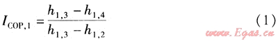 直膨式太陽(yáng)能熱泵系統(tǒng)的制熱性能系數(shù)ICOP,1的計(jì)算式為:
