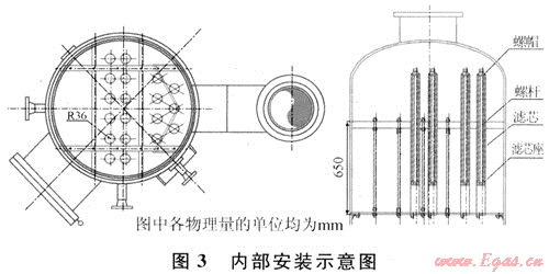 通過項目調(diào)研評估和可行性分析,決定拆除滌氣罐內(nèi)除沫網(wǎng),改裝19根高效過濾精度在0.05μm的頗爾纖維濾芯,方案經(jīng)過數(shù)次討論優(yōu)化,確定全部預制好到現(xiàn)場安裝,具體設(shè)計方案如圖2~4。
