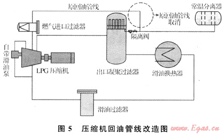 在運行過程中取樣檢查時發(fā)現(xiàn)出口凝聚過濾器原設(shè)計的回油管線有大量的液體返回到壓縮機進口,取樣分析內(nèi)含輕質(zhì)油、水和潤滑油,其中輕質(zhì)油占80%,水占15%,滑油占5%。關(guān)閉回油管線10min后取樣回收液量1200mL,按此計算一個月累計有510L,如此多液體返回系統(tǒng)循環(huán),增加了二次污染。針對此情況,果斷地將回油管線進行流程改造,將管線引入常溫分離器,利用兩端壓力差排液,同時利用常溫分離器的功能進行油氣水分離。改造如圖5所示。