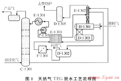 吸收塔C-1301底部排出的富TEG溶液經(jīng)TEG再生器H-1301頂部盤管E-1302與再生氣換熱升溫后進入閃蒸罐D-1302閃蒸,閃蒸后的富TEG液經(jīng)過濾器F-1301除去雜質(zhì)后,進入貧/富液換熱器E-1303與再生后的高溫貧TEG溶液進行換熱,換熱升溫后進入TEG再生器H-1301再生。從再生器緩沖罐D-1303流出的高溫貧TEG溶液,經(jīng)貧/富液換熱器E-1303換熱降溫后由TEG循環(huán)泵P-1301壓至貧液冷卻器E-1301進一步冷卻,滿足脫水工藝要求的TEG貧液送至吸收塔C-1301頂部。