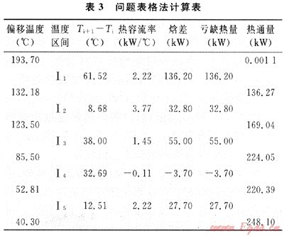 表3為應用問題表格法計算換熱網(wǎng)絡所需公用工程量和夾點位置。換熱網(wǎng)絡的夾點位于193.70℃,加熱量為0kW,冷卻量為248.10kW。