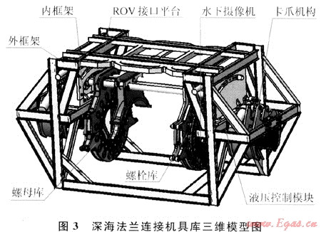 2) Acergy公司的MATIS系統(tǒng)陪93法蘭連接機(jī)具如圖2所示。該機(jī)具結(jié)構(gòu)是一體的,所有功能部件都安裝在外框架上,包括螺栓插入功能部件、螺母擰緊功能部件、機(jī)械手和一個(gè)存儲(chǔ)螺栓、螺母、密封墊片的機(jī)具倉(cāng)等。采用模塊化設(shè)計(jì)可依據(jù)連接管道尺寸、工作水深和連接管道形式的不同采用不同的組合方式。螺栓插入功能部件和螺母擰緊功能部件被安裝在一個(gè)滑動(dòng)梁上,在液壓缸的推動(dòng)下螺栓插入功能部件和螺母擰緊功能部件可沿著滑梁移動(dòng),完成螺栓插入等動(dòng)作。法蘭連接機(jī)具上設(shè)置ROV接口和浮力塊,整套機(jī)具可由ROV水下攜帶,并從ROV獲得動(dòng)力和控制信號(hào)。ROV可以在工作母船上安裝到連接機(jī)具上,也可以在水下與連接機(jī)具結(jié)合。對(duì)孔操作由水下電視監(jiān)測(cè),通過(guò)視覺(jué)觀察不斷調(diào)整誤差,完成對(duì)孔作業(yè)。該機(jī)具裝有一個(gè)存儲(chǔ)螺栓、螺母和密封墊片的機(jī)具倉(cāng),攜帶的螺栓、螺母和密封墊片數(shù)量能夠滿(mǎn)足三對(duì)法蘭的連接,所以一次下水可以進(jìn)行多次連接,并減少了由于螺栓、螺母或墊片跌落造成的連接失敗概率。
