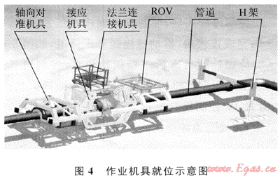 2) ROV攜帶輔助機(jī)具就位到工作地點(diǎn)后,軸向?qū)?zhǔn)機(jī)具和接應(yīng)機(jī)具將管道粗對(duì)準(zhǔn)。