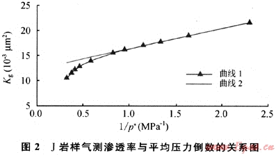 實際儲層巖石中,總是存在一些隨氣體流動而運移的微粒,當氣體通過巖石流動的流速增大到某一值時,附著在巖石孔道表面的微粒或松散的微粒在氣體的拖曳力作用下產(chǎn)生運移,微粒運移到細小的孔隙喉道處將堵塞氣體的流動通道,減小了氣體通過巖石流動的能力,在此流速下測得的氣體滲透率將小于由公式(1)所確定的氣體的滲透率;隨著氣體流速的增大,微粒運移堵塞愈嚴重,氣體滲透率減小的程度愈大,氣測滲透率與平均壓力倒數(shù)的關(guān)系將出現(xiàn)圖1中曲線2所示的特點。