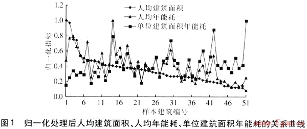 基于統(tǒng)計數(shù)據(jù)得到51幢樣本建筑的人均建筑面積、人均年能耗、單位建筑面積年能耗,為便于分析,對這3項數(shù)據(jù)進行了歸一化處理。將51幢公共建筑按歸一化處理后的人均建筑面積由大到小進行編號,三者的關(guān)系曲線見圖1。由圖1可知,隨著人均建筑面積的增加,人均年能耗呈現(xiàn)上升的趨勢,而單位建筑面積年能耗呈現(xiàn)下降的趨勢。