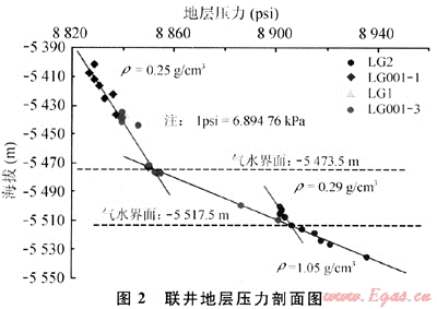 電纜式地層測(cè)試器的應(yīng)用實(shí)踐表明,一個(gè)構(gòu)造上的同井同層或不同井但同層的氣、水井(段)可進(jìn)行壓力系統(tǒng)分析,判斷儲(chǔ)層的橫向連通性,并用壓力梯度交會(huì)法確定區(qū)域上的氣水界面[1~3]。