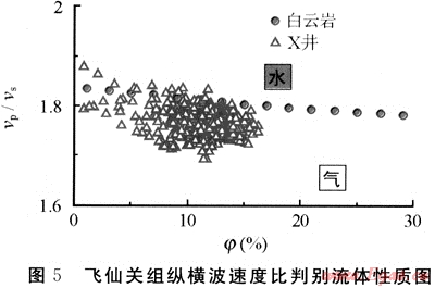 對(duì)以孔隙為主的白云巖或石灰?guī)r儲(chǔ)層來(lái)說(shuō),如果縱橫波速度比值落在白云巖或石灰?guī)r線以下,解釋為氣;反之,解釋為水。飛仙關(guān)組和長(zhǎng)興組經(jīng)過(guò)巖性校正后縱橫波速度比與孔隙度的交會(huì)點(diǎn)主要分布于白云巖線以下方,表明流體類型為氣層(圖5),與該段測(cè)試產(chǎn)氣相符合。