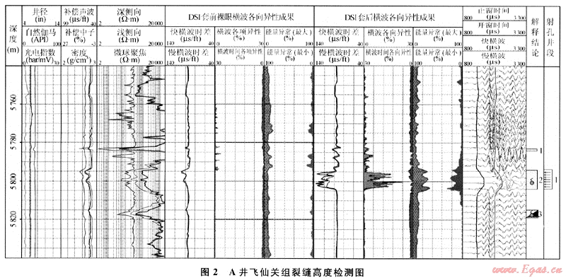 圖1是LG地區(qū)A井裂縫高度預(yù)測圖,可以看出:當(dāng)壓力增量為1MPa時,形成高度為8m的壓裂縫,壓裂縫延伸井段為5794~5804m;當(dāng)壓力增量超過1.0MPa時,壓裂縫繼續(xù)略有延伸。用A井套前、套后交叉偶極橫波測井資料檢測[5]了其裂縫高度(圖2),可以看出:壓裂前,5794~5804m各向異性不明顯,壓裂后,該井段呈現(xiàn)一定的各向異性,由此判斷壓裂縫井段為5794~5 804m,縫高為8m,表明該井實際的水力壓裂裂縫井段為5794~5804m,與預(yù)測結(jié)果一致。