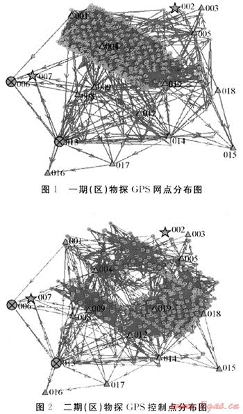 基于以上諸多因素,提出了“首級(jí)控制、分期(區(qū))布網(wǎng),首分網(wǎng)整體平差”的施工原則。即:首先在整個(gè)工區(qū)建立GPS骨架網(wǎng),根據(jù)施工順序在骨架網(wǎng)基礎(chǔ)上分兩期(區(qū))進(jìn)行GPS控制點(diǎn)加密;兩期(區(qū))加密GPS網(wǎng)分別連接骨架網(wǎng)的布測(cè)數(shù)據(jù)進(jìn)行平差處理。這樣既能及時(shí)提供施工所需的物探控制點(diǎn),又能保證整個(gè)網(wǎng)點(diǎn)精度的一致性。