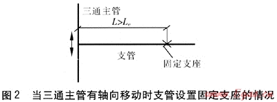 當三通主管有軸向移動時,支管設置固定支座的情況見圖2。三通主管的軸向移動越大,在三通產(chǎn)生的應力越大,三通越容易破壞。為使支管能夠吸收三通主管的軸向移動,減小由于三通主管的軸向移動在三通產(chǎn)生的應力,固定支座與三通的距離L應滿足L>Le,Le的計算式為[7]: