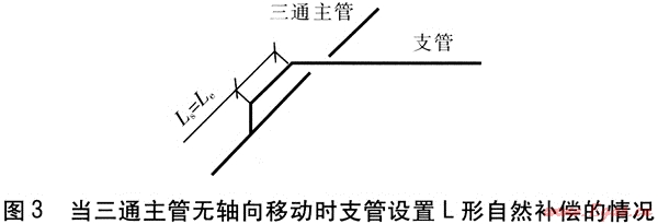 當在支管上無法實現(xiàn)自然補償時,可以考慮在支管上設置軸向補償器,軸向補償器的類型可根據(jù)供回水溫度、支管的管徑及其他技術要求選用。當三通主管無軸向移動時,支管設置軸向補償器的情況見圖5。為了降低支管的軸向移動對三通的推力,軸向補償器距三通的距離L應滿足L≤20m[7]。