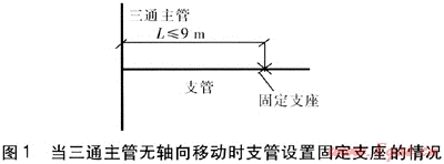 當三通主管無軸向移動時,支管設置固定支座的情況見圖1。運行中固定支座與三通之間的管道由于熱脹產(chǎn)生變形,固定支座與三通的距離越大,變形越大。當固定支座至三通的距離三達到一定值時,三通易由于支管的變形而破壞,為了限制支管上的熱脹變形向三通轉(zhuǎn)移,應滿足L≤9m[6、7]。