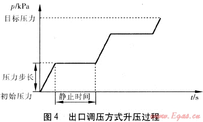 采用調(diào)壓器出口調(diào)壓方式進行調(diào)壓時,需設(shè)置的狀態(tài)參數(shù)包括壓力步長、靜止時間、目標(biāo)壓力。壓力步長是連續(xù)動作的壓力變化值。靜止時間是每個壓力步長動作完成后至下一步長開始的停頓時間。目標(biāo)壓力是需升壓或降壓后達到的壓力??刂破靼丛O(shè)定的壓力步長、靜止時間運行,出口壓力傳感器將出口壓力p的信號反饋到控制器,當(dāng)p等于目標(biāo)壓力時,升壓或降壓停止。圖4為采用出口調(diào)壓方式進行升壓的過程。