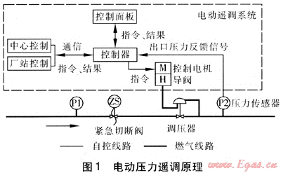 電動調(diào)節(jié)系統(tǒng)主要由控制器、壓力傳感器和控制電機組成。中心控制、廠站控制或控制面板給控制器輸入指令,控制器給控制電機信號,控制電機直接旋擰調(diào)壓器導(dǎo)閥的調(diào)壓螺桿,實現(xiàn)調(diào)壓。調(diào)壓過程中,控制器將調(diào)壓器出口處壓力傳感器的反饋值與指令目標(biāo)壓力值比較,根據(jù)比較結(jié)果來控制電機操作,直至調(diào)節(jié)到目標(biāo)壓力,停止動作。該方式調(diào)壓范圍寬,是直接的機械式作用。電機為防爆電機,供電壓力為220V。電動壓力遙調(diào)原理見圖1。