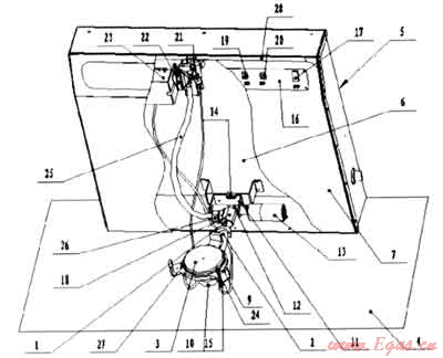 圖中所示:1、噴嘴,2、引射管,3、爐頭,4、櫥柜臺(tái)面或桌面,5、灶具主殼體,6、后殼面,7、前殼面,8、孔,9、鍋架,10、爐頭支撐架,11、轉(zhuǎn)軸固定架,12、轉(zhuǎn)軸,13、電動(dòng)機(jī),14、上限位開(kāi)關(guān),15、下限位開(kāi)關(guān),16、控制電路板,17、電源輸入控制開(kāi)關(guān),18、連接件,19、上升開(kāi)關(guān),20、下降開(kāi)關(guān),21、旋塞閥,22、旋鈕,23、脈;中點(diǎn)火器,24、點(diǎn)火針,25、分氣管,26、分氣管接頭,27、熱電偶式熄火保護(hù)裝置,28、進(jìn)氣管。