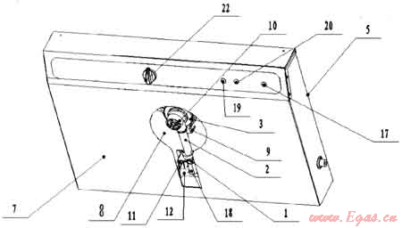如圖1所示,在本具體實(shí)施例中,本研究項(xiàng)目立式家用燃?xì)庠畎ü鈾C(jī)構(gòu)、點(diǎn)火機(jī)構(gòu)、燃燒機(jī)構(gòu)以及可豎立擺放在櫥柜臺(tái)面或桌面4上或安裝在緊挨櫥柜臺(tái)面或桌面4的墻壁上的灶具主殼體5,此時(shí)灶具主殼體5的高度和寬度都明顯大于其厚度;所述供氣機(jī)構(gòu)包括進(jìn)氣管20、旋塞閥21和旋鈕22,所述進(jìn)氣管28與旋塞閥21相通,所述旋鈕22安裝在旋塞閥21上,所述旋塞閥21通過(guò)分氣管25及分氣管接頭26與連接件19連接相通;所述點(diǎn)火機(jī)構(gòu)包括脈;中點(diǎn)火器23和點(diǎn)火針24,所述脈沖點(diǎn)火器23與旋塞閥21連接相通并通過(guò)導(dǎo)線與點(diǎn)火針24連接,所述點(diǎn)火針24設(shè)置在爐頭3上;所述燃燒機(jī)構(gòu)包括噴嘴1、引射管2、爐頭3和鍋架9;所述噴嘴1的一端與連接件18連接相通,其另一端與引射管2的一端連接相通;所述引射管2的另一端與爐頭3連接并與爐頭3的火孔相通;所述爐頭3連接有鍋架9:所述灶具主殼體5的后殼面6上連接有轉(zhuǎn)軸固定架11,所述轉(zhuǎn)軸固定架11上設(shè)有一根與其相對(duì)轉(zhuǎn)動(dòng)的轉(zhuǎn)軸12;所述燃燒機(jī)構(gòu)后端的連接件19與灶具主殼體5后殼面6的轉(zhuǎn)軸12連接;所述灶具主殼體5的前殼面7上設(shè)有供燃燒機(jī)構(gòu)在轉(zhuǎn)動(dòng)過(guò)程中通過(guò)的孔8,如圖2所示;所述爐頭3底部連接有一個(gè)爐頭支撐架10。在本具體實(shí)施例中,本研究項(xiàng)目還在爐頭3邊安裝有熱電偶式熄火保護(hù)裝置27。
