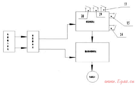 在本具體實(shí)施例中,如圖1和圖2所示,所述轉(zhuǎn)軸12的一端與設(shè)置在灶具主殼體5內(nèi)的電動(dòng)機(jī)13的轉(zhuǎn)軸連接;所述轉(zhuǎn)軸固定架11上設(shè)有上限位開(kāi)關(guān)14;所述燃燒機(jī)構(gòu)前端設(shè)有下限位開(kāi)關(guān)15;所述電動(dòng)機(jī)13、上限位開(kāi)關(guān)14及下限位開(kāi)關(guān)15均與控制電路板16電連接;所述控制電路板1 6 1-還電連接有電源輸入控制開(kāi)關(guān)17、上升開(kāi)關(guān)19及下降開(kāi)關(guān)20。所述的電動(dòng)機(jī)13、上限位開(kāi)關(guān)14、下限位開(kāi)關(guān)15、上升開(kāi)關(guān)19、下降開(kāi)關(guān)20以及控制電路板16組成一個(gè)可控制轉(zhuǎn)軸12轉(zhuǎn)動(dòng)的轉(zhuǎn)軸自動(dòng)轉(zhuǎn)動(dòng)裝置。