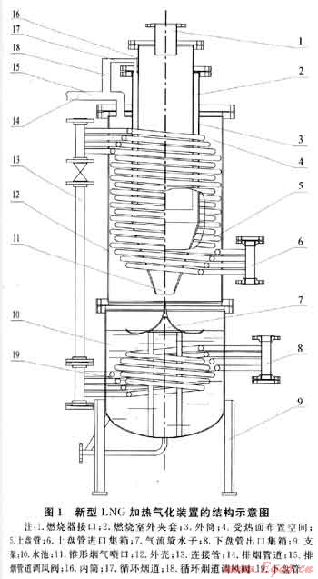 關(guān)鍵詞:LNG加熱氣化裝置;煙氣自擊回旋;結(jié)構(gòu)設(shè)計(jì);氣流旋水子;錐形煙氣噴口;自動(dòng)注水;試驗(yàn)研究