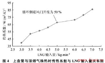 圖4為上盤管與濕煙氣換熱時(shí)傳熱系數(shù)與LNG輸入量的關(guān)系圖。反映了當(dāng)燃料天然氣輸入熱負(fù)荷不變、循環(huán)煙道調(diào)風(fēng)門的開度為50%時(shí),濕煙氣與上盤管換熱的傳熱系數(shù)與LNG輸入量之間的關(guān)系,此時(shí)上盤管外濕煙氣量基本不變,傳熱系數(shù)的變化主要由管內(nèi)LNG的對流換熱系數(shù)決定。隨著LNG輸入量的增大,其管內(nèi)流速上升,導(dǎo)致上盤管傳熱系數(shù)增大,且隨著LNG輸入量的增大,在輸入熱負(fù)荷不變時(shí),其溫升下降,從而增大了管內(nèi)外的傳熱溫差,促進(jìn)了傳熱。