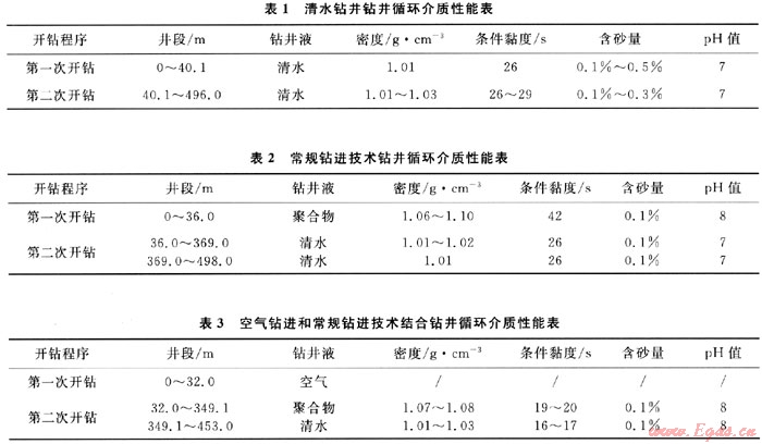 示范區(qū)內(nèi)部分井在出水點(diǎn)以上地層利用高壓空氣和泡沫劑作為循環(huán)介質(zhì),有效提高了鉆進(jìn)效率。隨著井內(nèi)出水量不斷增大,采用清水作為循環(huán)介質(zhì)鉆進(jìn),圓滿(mǎn)完成了施工任務(wù)。