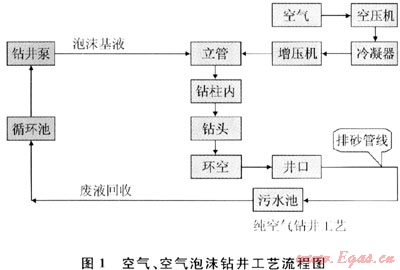 空氣、空氣泡沫鉆井是以空氣或空氣泡沫作為循環(huán)介質(zhì),采用潛孔錘沖擊鉆進(jìn)工藝技術(shù)進(jìn)行鉆井[4~5],其工藝流程如圖1所示。在潘河示范工程采用空氣、空氣泡沫鉆井?dāng)?shù)約占總井?dāng)?shù)的60%。
