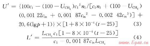 式中U′為特定溫度、壓力和組分下的爆炸上限,%;c1為氣相中甲烷的摩爾分?jǐn)?shù),且有cin=1-c1;以,為氧氣與單位摩爾的甲烷發(fā)生燃燒反應(yīng)時(shí)的摩爾數(shù);L′為特定溫度、壓力和組分下的爆炸下限,%。