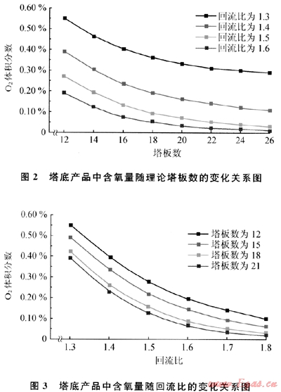 在精餾塔為進(jìn)料狀態(tài),塔頂及塔底采出量固定的情況下,塔底產(chǎn)品中氧氣含量受2個(gè)主要參數(shù)即回流比和理論塔板數(shù)的影響。在精餾塔進(jìn)料壓力為0.2MPa,溫度為-164℃的條件下,不同回流比條件下塔底產(chǎn)品中氧氣含量與理論塔板數(shù)的關(guān)系如圖2所示,不同理論塔板數(shù)條件下塔底產(chǎn)品中氧氣含量與回流比的關(guān)系如圖3所示。由圖2可知,在固定回流比的情況下,塔底產(chǎn)品中的氧氣含量隨著理論塔板數(shù)的增加而降低,而且隨著理論塔板數(shù)的增加,氧氣含量曲線逐漸變得平緩,也就是說在精餾塔塔板數(shù)比較多時(shí),通過增加塔板的數(shù)量來降低煤層氣中的氧氣含量的效果已經(jīng)不明顯。圖3反映出在理論塔板數(shù)量固定的情況下,塔底產(chǎn)品中的氧氣含量隨回流比的增加而降低,而且曲線隨著回流比的增加也逐漸變得平緩,說明回流比較大時(shí),再依靠增加回流比來降低煤層氣中的氧氣含量的效果也不明顯。由此可知,不能只依賴調(diào)節(jié)某一個(gè)參數(shù)來降低煤層氣中的氧氣含量,而是要同時(shí)考慮其他參數(shù)來綜合調(diào)節(jié)。模擬計(jì)算過程中,在精餾塔進(jìn)料壓力為0.2MPa,溫度為-164℃,回流比為1.4,理論塔板數(shù)為25的情況下,塔底產(chǎn)品中氧氣的含量為0.16%(體積分?jǐn)?shù)),此時(shí)產(chǎn)品中的氮?dú)鉃?。