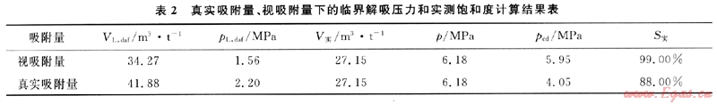 計算結果表明:真實吸附量情況下的臨界解吸壓力和實測飽和度要小于視吸附量情況下的臨界解吸壓力和實測飽和度,視吸附量情況下的臨界解吸壓力為5.95MPa,而真實吸附量情況下的臨界解吸壓力為4.05MPa,兩者相差1.90MPa。