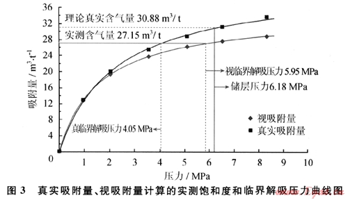 選取安陽礦區(qū)雙全井田-煤層氣參數(shù)井實測儲層參數(shù)及等溫吸附數(shù)據(jù),求取了真實吸附量和視吸附量下的吸附參數(shù),及由此推導出臨界解吸壓力和實測飽和度(表2、圖3)。等溫吸附實驗溫度為20℃,測試煤層為二1煤層。