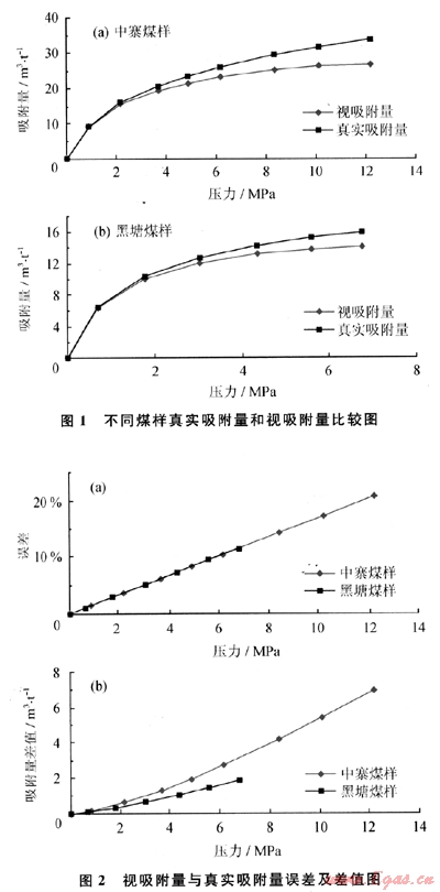 結果顯示(圖1、2):在相對低壓范圍(0~2MPa),視吸附量和真實吸附量差別較小,誤差小于5%,差值小于1m3/t。這與一些研究者在低壓范圍內(nèi)進行液氮吸附實驗得出的數(shù)據(jù)一致,即真吸附量和視吸附量基本沒有差別閻。