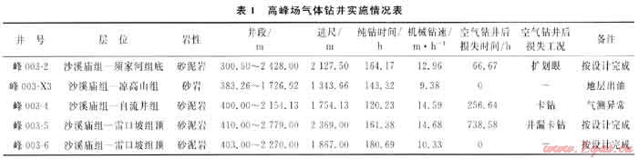 高峰場(chǎng)區(qū)塊氣體鉆井共應(yīng)用5口井——峰003-2、峰003-X3、峰003-4、峰003-5、峰003-6井(表1),氣體鉆井取得的進(jìn)尺較高,總進(jìn)尺9461.29m,3口井按設(shè)計(jì)井段完成,最高機(jī)械鉆速14.68m/h,平均機(jī)械鉆速12.39m/h。氣體鉆井5口井中有2口井無(wú)時(shí)間損失,其余3口井總損失時(shí)間1061.89h,其損失時(shí)間很大部分是由于氣體鉆井后的后續(xù)技術(shù)措施不妥造成的。
