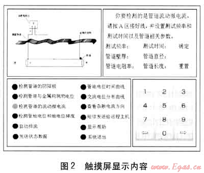 ④ 顯示模塊:顯示模塊選用221.4mm×124.5mm壓電式觸摸液晶顯示屏,主要顯示數(shù)據(jù)采集過程的狀態(tài)值和最終處理值,并實現(xiàn)人性化的觸摸動作指令。其顯示任務有顯示管道的陰陽極、管道與金屬構(gòu)筑物的電位、管道流動的微電流、管地電位和地電位梯度、自動排流的狀態(tài)數(shù)據(jù)、管地電位-時間曲線、交流電位-時間曲線、雜散電流方向、無線發(fā)送短信狀態(tài)、顯示幫助等。顯示分為4個區(qū)域,左上角顯示各功能模塊的原理及原理圖,右上區(qū)域顯示設置值和狀態(tài)值,左下區(qū)域為顯示內(nèi)容選單,右下區(qū)域為鍵盤。顯示內(nèi)容示例見圖2。