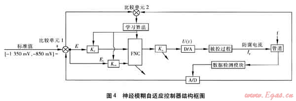 圖4中,F(xiàn)NC表示神經(jīng)模糊自適應控制器,A/D表示模數(shù)轉(zhuǎn)換器,D/A表示數(shù)模轉(zhuǎn)換器,Ke表示偏差系數(shù),Kec表示偏差變化率系數(shù),E表示偏差,Ec表示偏差變化率,Ku表示防腐調(diào)整系數(shù),Ip表示實際防腐電流,f表示干擾信號。干擾信號f來源于大地磁場的波動、土壤的濕度和松緊度變化、季節(jié)的變更以及野外強電電位突變等。干擾信號的出現(xiàn),將影響鋼質(zhì)管道管地電位的檢測值且改變管道的腐蝕狀況。