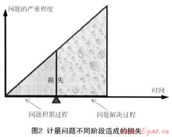 一般在發(fā)生卡表計量問題的情況下,燃氣企業(yè)往往是承擔損失的一方,由于計量問題所帶來的流量損失,與“問題的程度”和“發(fā)現(xiàn)及處理問題所用的時間”成正比關(guān)系。計量問題的出現(xiàn)往往是時間積累的結(jié)果,如圖2所示,計量問題經(jīng)過一段時間的積累,達到一定的“度”,從而引起關(guān)注,在問題積累的過程中已經(jīng)給企業(yè)帶來了一定的損失,問題出現(xiàn)后往往還需要相當一段時間加以解決,而解決問題的過程無疑將積累更多的損失。燃氣公司為此所付出的時間成本相當可觀。