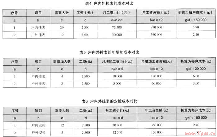 按照每年遞增新用戶2萬戶為例,每年需要新增抄收人員為:戶內(nèi)抄表4人,戶外抄表2人。