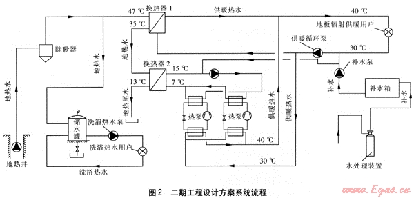 二期工程設(shè)計(jì)方案的系統(tǒng)流程見圖2。地?zé)崴槌龊螅?jīng)過除砂器進(jìn)入板式換熱器1,將30℃地板輻射供暖系統(tǒng)回水加熱至40℃。經(jīng)過板式換熱器1的35℃地?zé)崴?jīng)板式換熱器2由熱泵提取熱量,作為熱泵的低溫?zé)嵩?。地?zé)嵛菜疁囟葹?3℃。