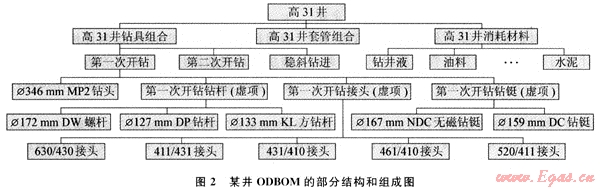 在鉆井過程中,一口井物料的消耗可由鉆井設(shè)計所形成的鉆具組合、套管組合、鉆井液和其他主要輔助材料等來確定[6]。將鉆井設(shè)計所形成方案中物料的使用及物料之間的關(guān)系與傳統(tǒng)制造業(yè)BOM進行對比,可構(gòu)造出類似于制造業(yè)ERP中BOM的石油鉆井物料清單(Oil Drilling Bill Of Material,即ODBOM)。在ODBOM的構(gòu)造中,從結(jié)構(gòu)上可將一口井視為一個產(chǎn)品,結(jié)構(gòu)中的第一層以虛項[3]形式分別表示鉆井過程中鉆具組合、套管組合所需使用器材的模塊和消耗材料模塊。其中消耗材料模塊清單由鉆井液、油料、泥漿等組成。而鉆具組合和套管組合中所使用器材的清單結(jié)構(gòu)需根據(jù)鉆井開次分別構(gòu)造。以鉆具組合中各種鉆井器材使用為例,油氣井的施工過程是由多次開鉆順序組成,每次開鉆鉆進過程中所使用的各種鉆井器材等,按照鉆具組合設(shè)計,這些器材之間(如鉆頭、鉆鋌、鉆桿等)是以一定的方式形成連接組合關(guān)系。下面是某口井第一次開鉆的鉆具組合: