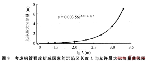 2) 根據(jù)《輸氣管道工程設(shè)計(jì)規(guī)范》[3]的有關(guān)規(guī)定,在輸氣管道系統(tǒng)中,支管道沒有軸向約束(如固定支墩或其他錨固件)時(shí),使管道附件產(chǎn)生的彎曲應(yīng)符合公式:σe≤0.72σse為組合應(yīng)力;σs為管道的最低屈服強(qiáng)度),按假設(shè)受力模型的簡化分析和采用的算例,X70鋼管屈服強(qiáng)度為485MPa,則0.72σs=349.2MPa,可得管道通過不同長度沉陷區(qū)的允許最大沉陷量和其回歸方程(圖8)。