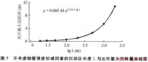 1) 按假設(shè)受力模型的簡化分析和所采用的計(jì)算方法,X70鋼管屈服強(qiáng)度為485MPa,并以此作為管道遭遇危險(xiǎn)的判定標(biāo)準(zhǔn),在不考慮鋼管強(qiáng)度的折減因素前提下,可得管道通過不同長度沉陷區(qū)的允許最大沉降量,并用最小二乘法建立了管道允許最大沉陷量與沉陷區(qū)長度的回歸方程,結(jié)果如圖7所示。